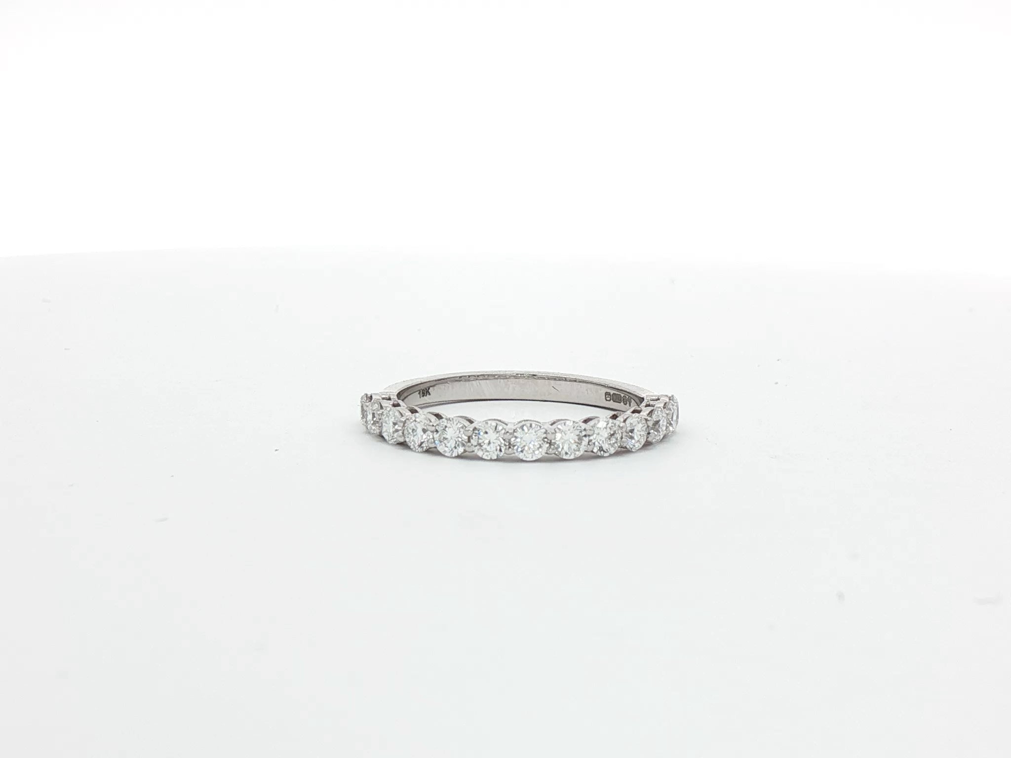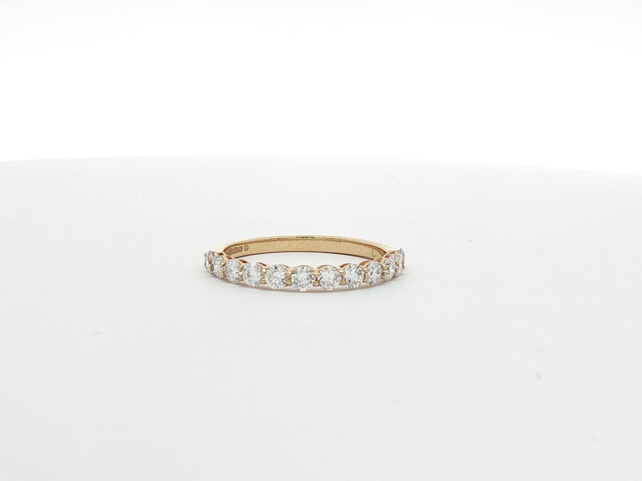 Total Diamond Weight: 0.80ctStone Shape: RoundDiamond Quantity: 13 DiamondsFinger Size: MDiamond Size: 2.5mmMetal: 9k GoldDiamond Quality: E VS/VVSSetting: Shared ClawUK Hallmarked: YesConflict-Free Diamonds: YesJewellery Report: World Gemological Institute