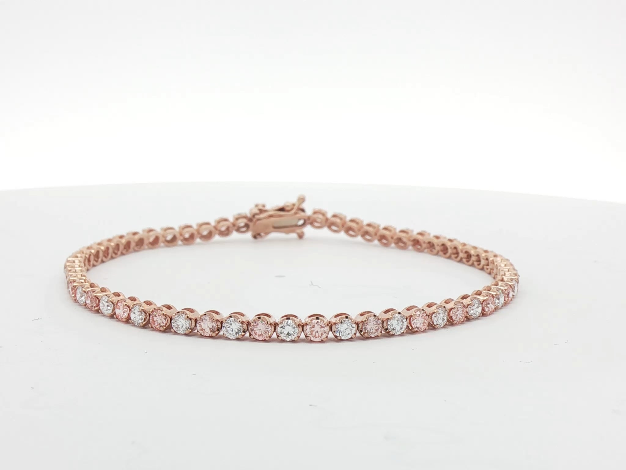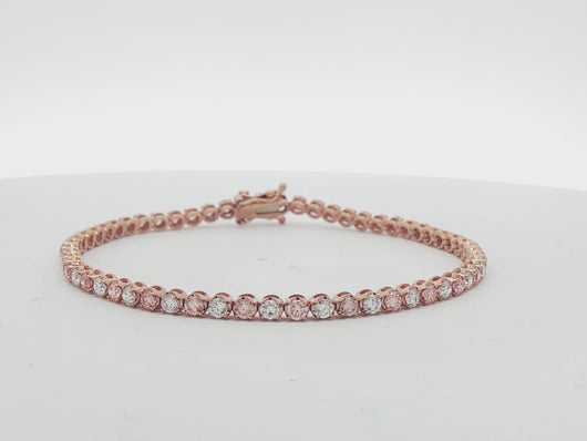 Bring a touch of vibrant sophistication to your collection with our Pink & White Fancy-Coloured Lab-Grown Crown-Set Tennis Bracelet, set in 9k Rose Gold. Each sparkling pink and white stone is elevated in a crown setting, which not only maximizes light for dazzling brilliance but also gives each gem a more rounded, fuller appearance.