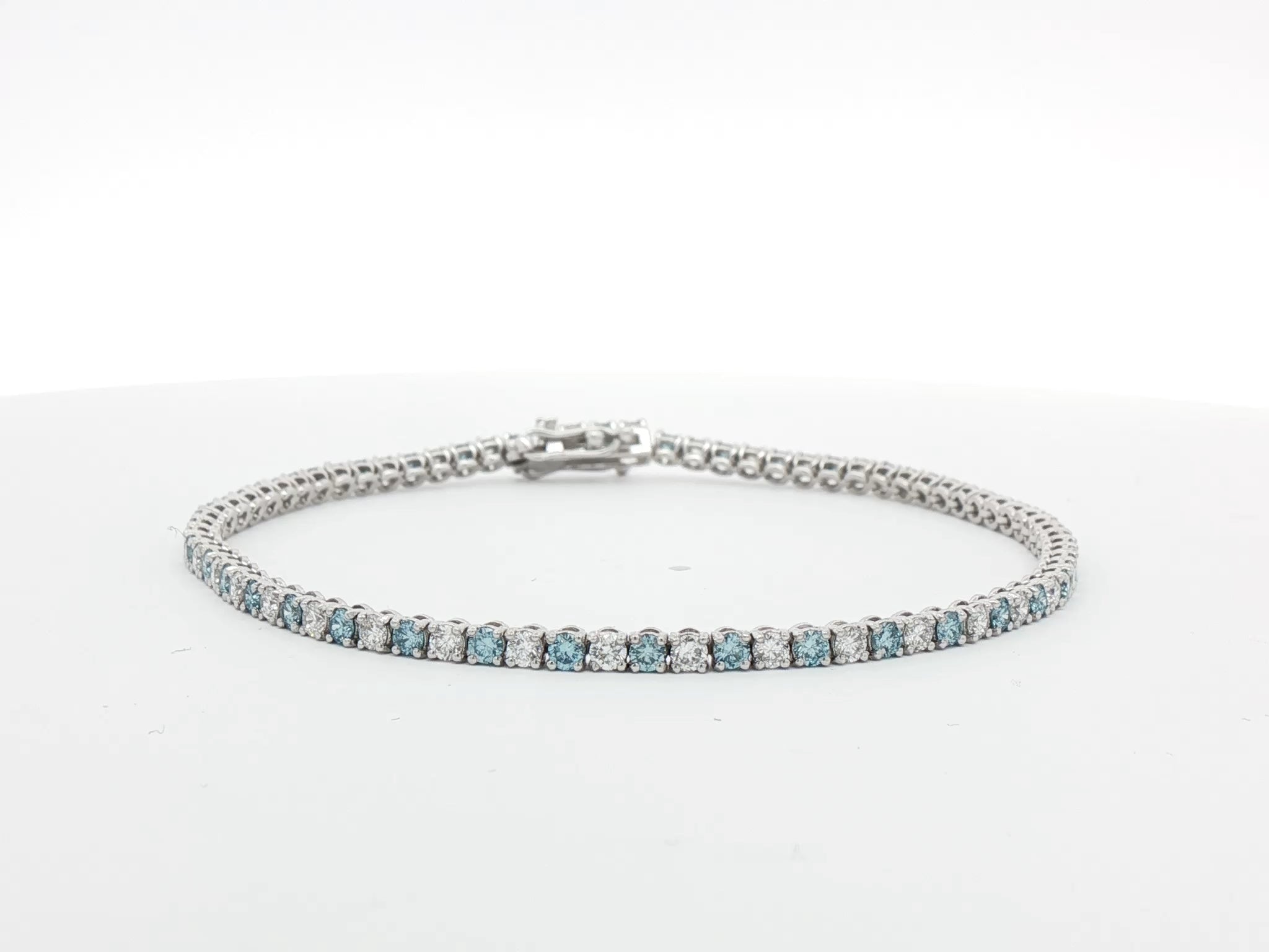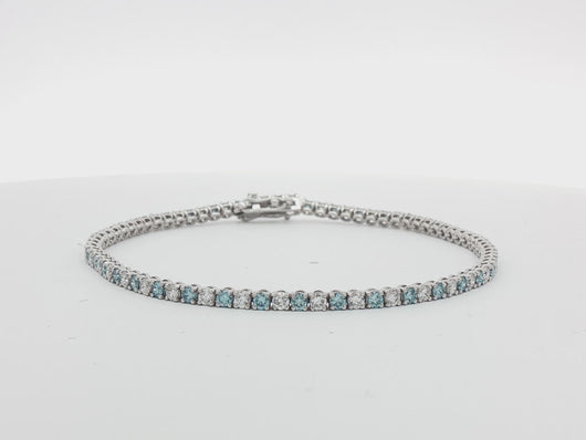 Add a vibrant touch of elegance with our Blue & White Fancy-Coloured Lab-Grown Four-Claw Tennis Bracelet, set in 9k White Gold. Featuring a stunning mix of sparkling blue and white stones, each diamond is expertly secured in a classic four-claw setting, allowing maximum light to enhance their brilliance.